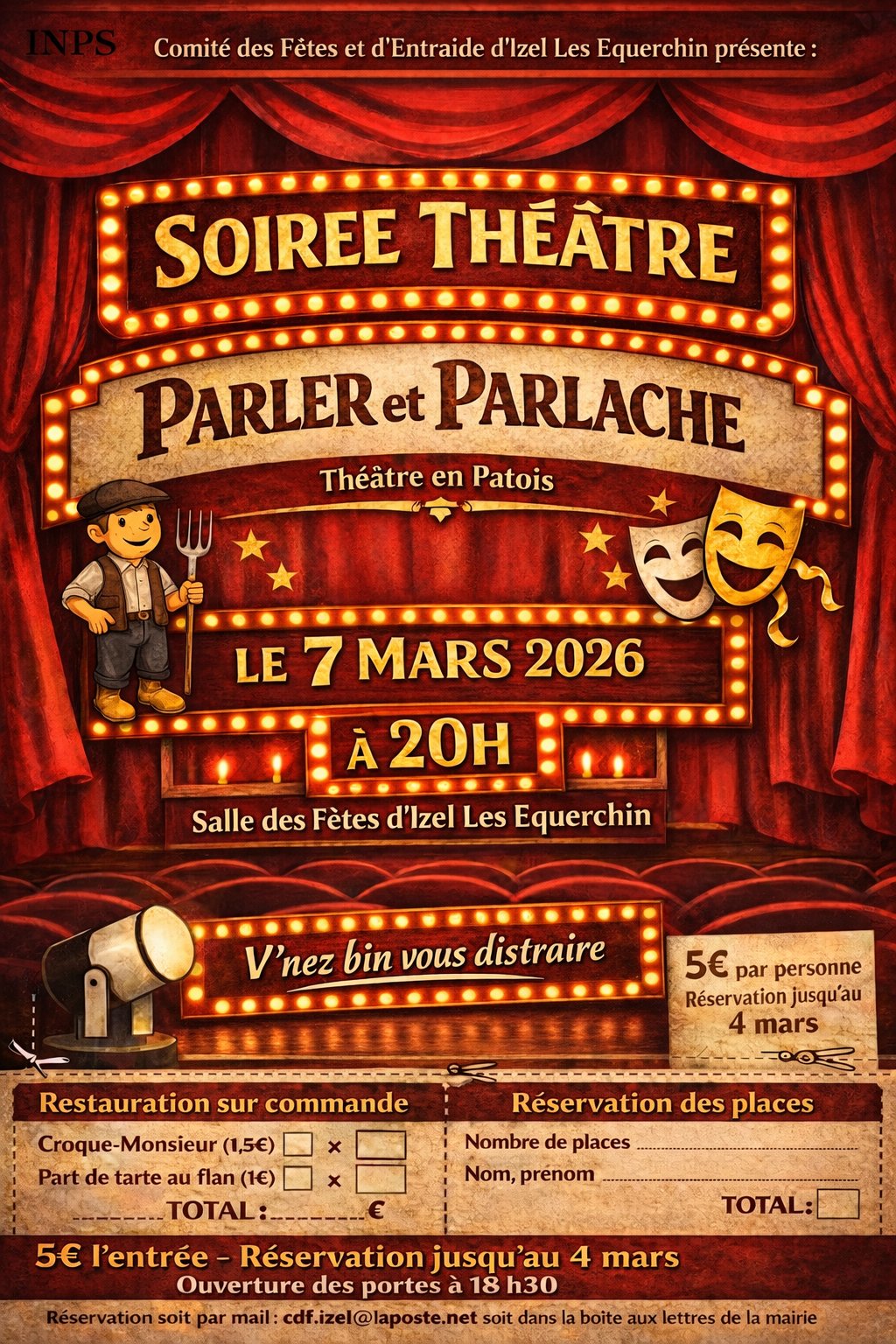 La mairie d'Izel les Esquerchin nous informe qu'une soirée théâtre "Parler et parlache" aura lieu dans leur salle des fêtes le 7 mars à 20h.