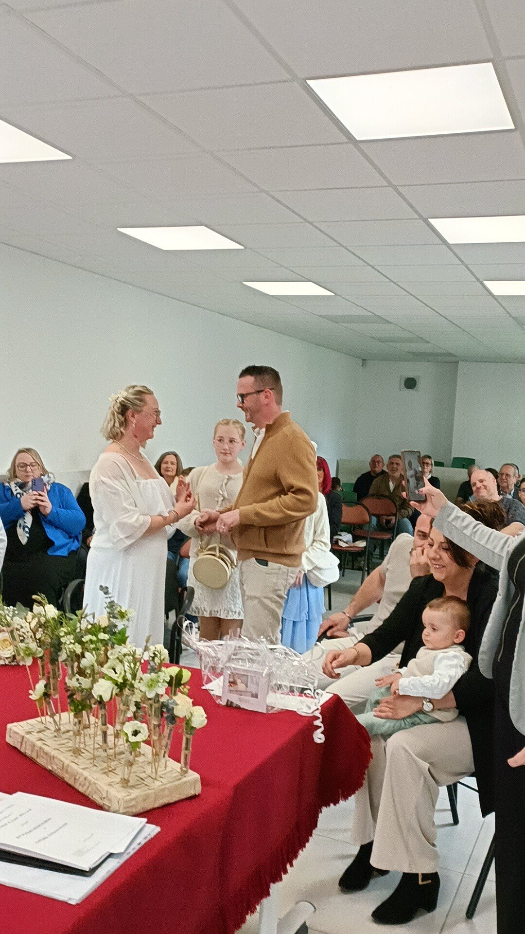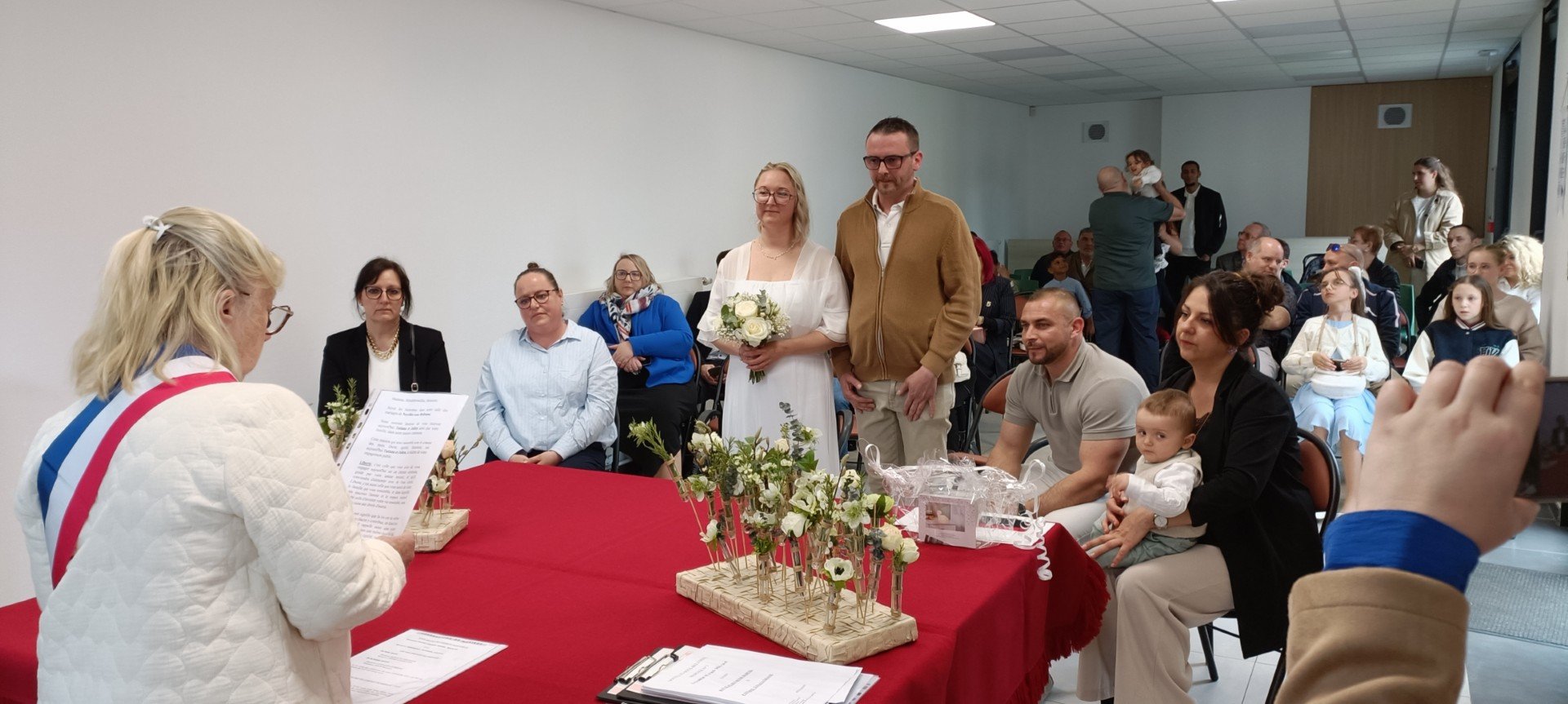 Le programme réservait une surprise de taille. Sitôt le certificat de baptême signé, Monsieur le Maire a repris la parole pour annoncer une seconde cérémonie : celle de l'union civile des parents.
